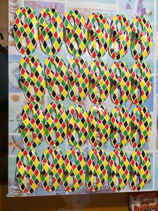 Lotto di 24 maschere di Carnevale. - Fantasia a rombi colorati: rosso, giallo, verde e nero. - Design tipico di Arlecchino.
