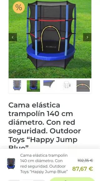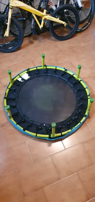 Trampolino da salto. Per bambini e adulti. Divertimento e ginnastica. Utilizzato molto poco. È come nuova. Presenta solo un piccolo strappo (non cucito) in una zona del tessuto elastico ma può essere facilmente riparato. Non è necessario ripararlo per poterlo utilizzare perché la cucitura è molto piccola e non influisce sul salto. Misura 1,40 zone di salto. Altezza 2,40 Larghezza 1,80