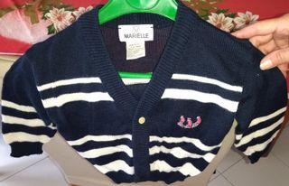 Cardigan per bambino, perfetto per completare ogni outfit. - Colore blu navy con righe bianche. - Dettaglio con tre barchette con vele rosse ricamati sul petto. - Chiusura con bottoni. - Scollo a V.