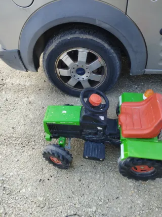 Trattore a pedali di colore verde, ideale per bambini dai 4 anni in su. Design robusto e accattivante. Volante per dirigere. Sedile comodo. Pala frontale. Grandi ruote. Non lo uso mai, ci metto solo delle adesivi.
