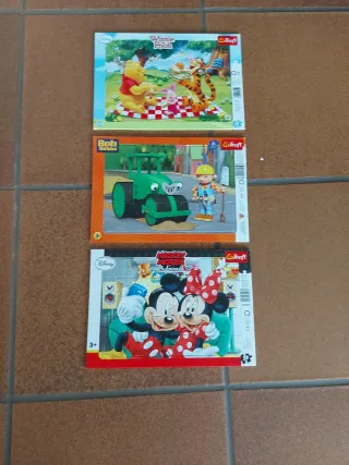 Set di tre puzzle per bambini, ideali per bambini dai 3 ai 6 anni. Include personaggi di Disney e Bob il costruttore. - Puzzle di Winnie the Pooh e Tigger. - Puzzle di Bob il costruttore con un trattore. - Puzzle di Mickey e Minnie Mouse.