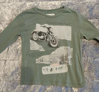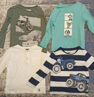 Set di quattro magliette a maniche lunghe per bambini. Taglia 4 anni. - Maglia verde con stampa di moto e città. - Maglia blu con stampa di cani Cool Dogs. - Maglia bianca con bottoni. - Maglia a righe blu e bianche con stampa di trattore e monster truck.