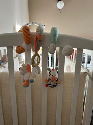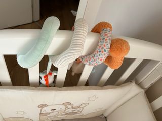 Spirale gioco in tessuto soft con texture sensoriali, sonaglino e 3 pendenti: una zebra a forma di anello, uno specchietto e un tenero orsetto con squeaker. Brand: Baby Smile. Comprato da Prenatal.