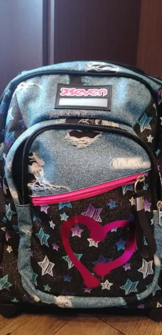 Zaino Seven con rotelle, perfetto per la scuola. Ha un design unico con stelle e cuore. - Tessuto resistente. - Dettagli in denim. - Zip colorata.