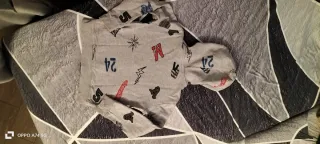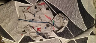 Set per bambino di 7/8 anni. - Felpa grigia con cappuccio e fodera in pile. - Chiusura con zip frontale. - Due tasche anteriori. - Dettagli con logo. tutto perfetto !