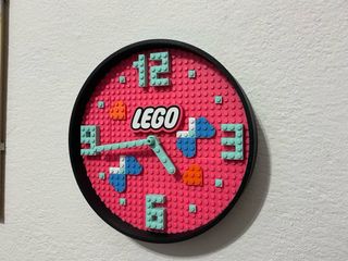 Orologio da parete con un design ispirato ai mattoncini LEGO. - Base rosa con dettagli colorati. - Logo LEGO centrale. - Lancette azzurre.