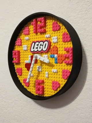 Orologio da parete con un design ispirato ai mattoncini LEGO. Perfetto per aggiungere un tocco di colore e divertimento a qualsiasi stanza. - Base gialla con texture a mattoncini. - Numeri e cuori decorativi rosa e rossi. - Logo LEGO centrale.