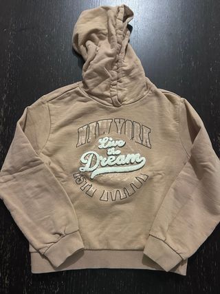 Felpa color beige con cappuccio, taglia 9 anni. - Stampa New York Live the Dream sul davanti. - Polsini e fondo a costine. - Condizioni discrete.