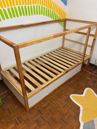 Letto IKEA modello Kura in legno, ideale per cameretta. - Struttura in legno di pino. - Rete a doghe inclusa. Vendo struttura letto ikea kura. Condizioni ottime e tenuto in ottimo stato. Completo di tutte le parti, viti e doghe. Compreso nel prezzo materasso 90x200 utilizzato raramente e acquistato 2 anni fa.