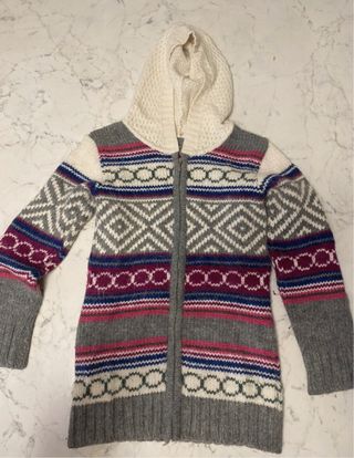 Cardigan con cappuccio e zip per bambina, taglia 6 anni. Presenta un design colorato con motivi geometrici e a cerchi. - Zip frontale. - Cappuccio foderato. - Polsini e fondo a costine - lana 15%