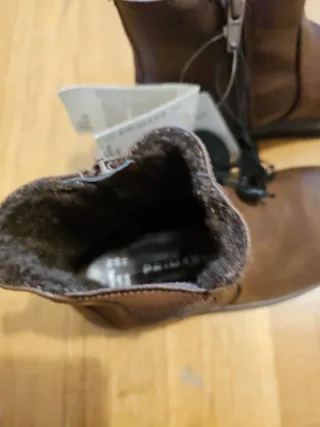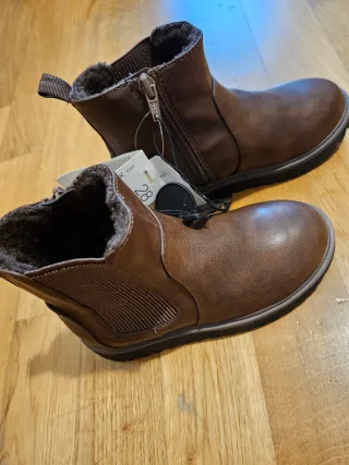 Stivaletti da bambino marrone, nuovi con cartellino. - Taglia 28. - Interno foderato in pelliccia sintetica per un maggiore calore. - Chiusura laterale con zip. - Inserti elastici laterali per una calzata comoda.