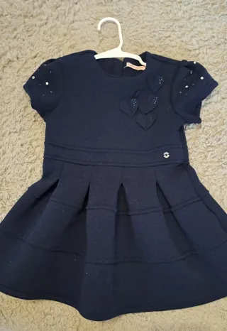 Bellissimo abito Original Marines di colore blu, perfetto per le occasioni speciali. - Maniche corte con dettagli luminosi. - Applicazione di cuori sul petto. - Gonna a pieghe. - Cintura con dettaglio metallico.