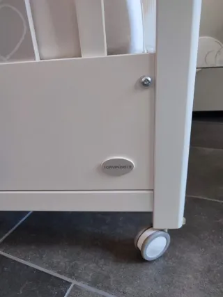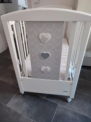 Lettino Foppapedretti modello Lovely, ideale per i più piccoli. Presenta un pannello decorativo con cuori e orsetti. - Design con cuori grigi. - Applicazioni a forma di orsetto. - Struttura in legno bianco. Praticamente nuovo usato pochissimo compreso di materassino, cassetto, spondina regolabile, ruote per muoverlo, doghe in legno altezza regolabile in due posizioni, se abbassi la doga del tutto si trasforma in divanetto. Ritiro a mano non spedisco Zona Volpiano (Torino)