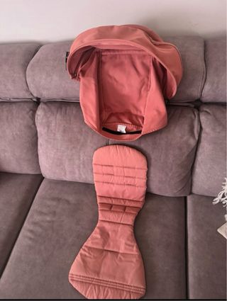 Set di materassino e capota per passeggino Babyzen Yoyo. Colore corallo. Tessuto imbottito nel materassino. Capota con visiera. Include materassino e capota. La capota ha un cuciture visibili nella terza foto. Guarda il mio profilo per altri accessori e passeggini yoyo.