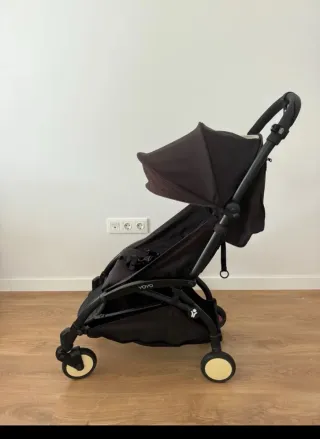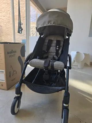 Passeggino Yoyo in buone condizioni, ideale per passeggiate. Include vari accessori: colore marrone e grigio, capottina, cinture di sicurezza, cestino inferiore, seggiolino per neonati.