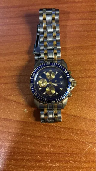 Elegante orologio da polso con quadrante blu e dettagli dorati. - Cinturino bicolore acciaio e oro. - Lunetta girevole blu con indici. - Funzione cronografo. - Datario visibile. NON FUNZIONABTE , potrebbe essere riparabile