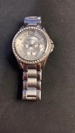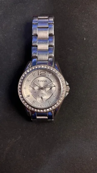Elegante orologio da polso da donna con dettagli luminosi. - Cinturino in metallo argentato. - Quadrante bianco con indici e lancette argentate. - Lunetta impreziosita da cristalli scintillanti. - Funzionante ma manca batteria