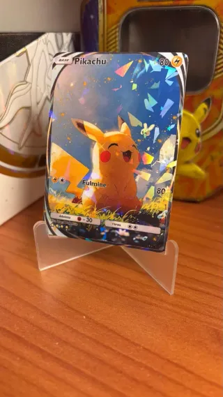 Carta Pokémon Base di Pikachu con 80 HP. - Illustrazione di Fulmine. - Debolezza: -30. - Resistenza: Nessuna.
