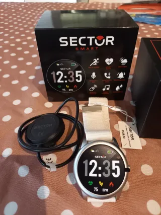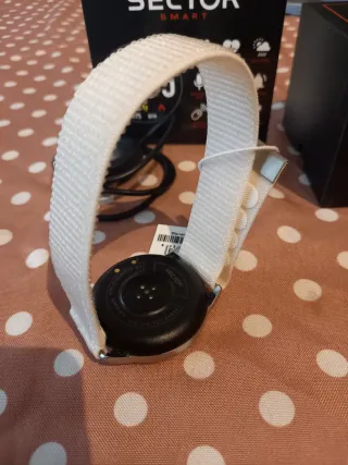 Smartwatch Sector S-01 con cinturino bianco e cassa argentata. Include caricabatterie. - Cinturino in tessuto bianco. - Cassa in metallo color argento. - Caricabatterie magnetico Sector.