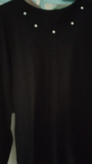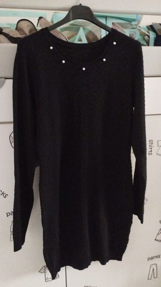 Elegante maglione lungo con dettagli di perline sul collo. Un capo versatile per ogni occasione. - Maniche lunghe. - Tessuto lavorato. - Perline decorative sul girocollo.