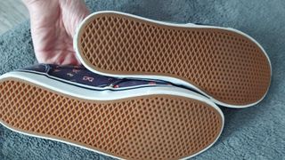 Scarpe Vans da donna con una divertente fantasia di cuori su sfondo blu. - Modello slip-on. - Suola in gomma antiscivolo.