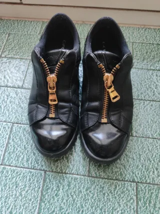 Eleganti scarpe Geox da donna, numero 37. Un modello dal design moderno con zip dorata. - Tomaia in pelle nera. - Dettagli lucidi sulla punta. - Zip frontale dorata.