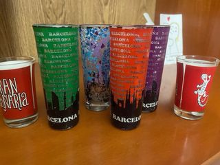 Set di sei bicchieri da shot con decorazioni a tema. - Bicchieri in vetro. - Design con skyline e scritte. - Un bicchiere con disegno di lucertola. - Un bicchiere con scritta Gran Canaria.