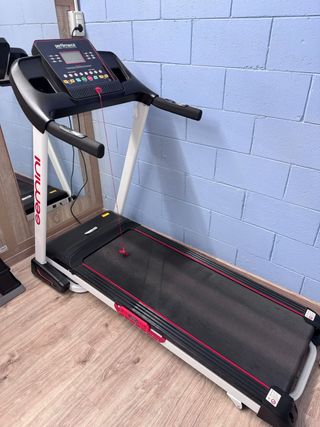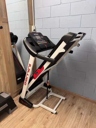 Tapis roulant Gemini in buone condizioni, ideale per allenamenti a casa. - Design moderno con finiture rosse. - Manubri ergonomici. - Console con display. - Cavo di sicurezza rosso.