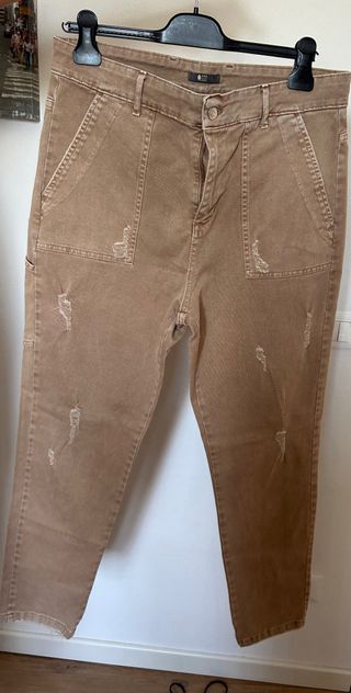 Pantaloni in cotone color beige, con un look vissuto e dettagli strappati. - Tasche frontali. - Passanti per cintura. - Chiusura con zip e bottone.