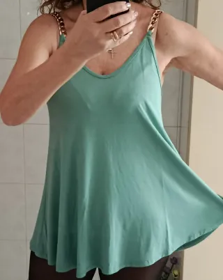 Top svasato verde Tiffany con un design moderno e femminile. Sull'etichetta tg 2, io porto la 42, ma copre più taglie essendo molto largo ed elasticizzato - Bretelle con dettaglio a catena dorata in materiale sintetico - Tessuto morbido e fluido in viscosa 95% e elastane