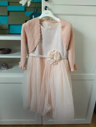Elegante vestito da comunione per bambina, perfetto per occasioni speciali. - Colore rosa cipria. - Tessuto glitterato sul corpetto. - Gonna in tulle multistrato. - Cintura con fiore decorativo.