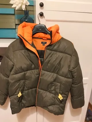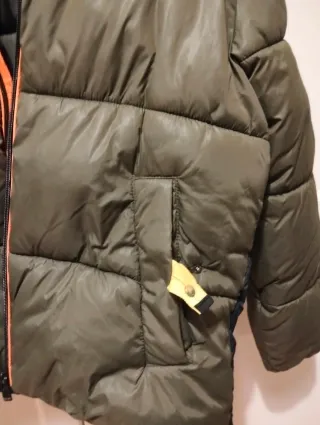 Giubbino imbottito per bambino con cappuccio. - Colore verde militare. - Dettagli arancioni. - Chiusura con zip.