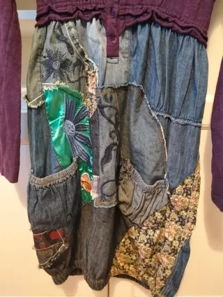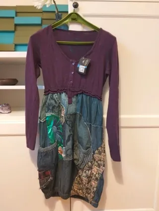 Vestito Desigual con un design unico e originale. - Parte superiore a maniche lunghe in maglia viola. - Gonna patchwork in denim e tessuti fantasia. - Dettagli con tasche applicate.