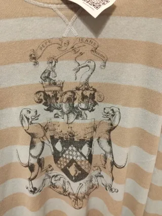 Maglione a maniche lunghe con fantasia a righe orizzontali. - Fantasia a righe beige e azzurre. - Stemma Pepe Jeans London sul davanti. - Dettaglio a righe corallo sul fondo e sui polsini.