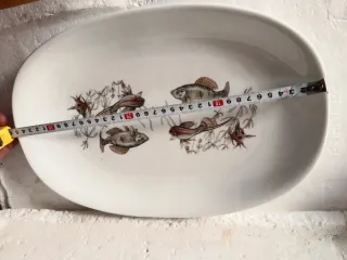 Elegante piatto da portata ovale in porcellana, perfetto per servire pietanze a base di pesce. Il decoro presenta una vivace scena con pesci e alghe. - Forma ovale. - Decorazione con pesci. - Materiale: porcellana.