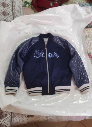 Giubbotto bambina blu e bianco con scritta di paillettes. Ottime condizioni - Colore blu - Dettagli con paillettes iridescenti - Scritta Star sul davanti - Maniche con inserti trapuntati e lucidi - Polsini e fondo a costine con strisce bianche e nere