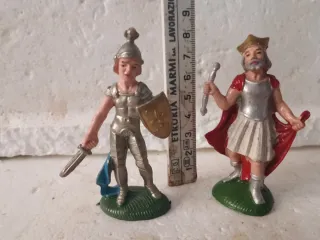 Due figure di centurioni in ideali per presepe o collezionismo. - Un centurione con elmo, scudo dorato e spada. - Un centurione con corona, mantello rosso e scettro.