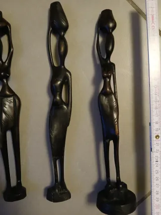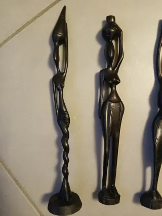 Set di sculture in legno realizzate a mano con stile africano. Ogni pezzo è unico, importo cadauno - Materiale: legno scuro. - Design stilizzato e artistico. - Base stabile per ogni figura.