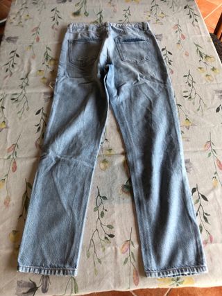 Jeans dal taglio dritto con dettagli strappati. - Vita media. - Tasche anteriori e posteriori. - Chiusura con zip e bottone.