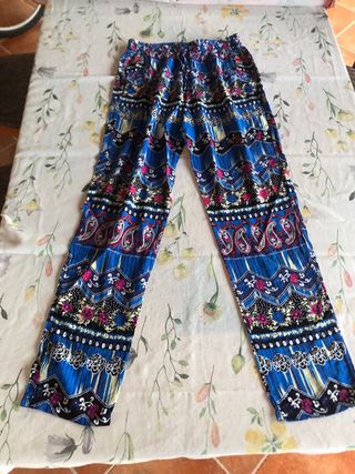 Pantaloni leggeri con una fantasia vivace e colorata. - Tessuto leggero e confortevole. - Vita elasticizzata per una vestibilità comoda. - Design unico con motivi etnici e floreali.Tasche laterali