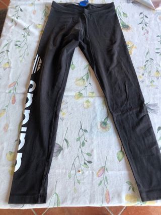 Comodi leggings neri con logo Adidas. - Logo Adidas stampato sul lato. - Tessuto elasticizzato.Come da foto dietro in vita vi e’un piccolo buchino ed il tessuto e’schiarito