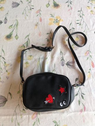 Piccola borsetta a tracolla, perfetta per portare con te l'essenziale. - Patch a forma di cuore con freccia. - Patch a forma di stella rossa. - Patch con occhietti. - Tracolla regolabile.13x20