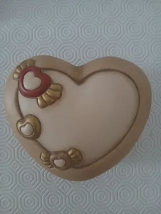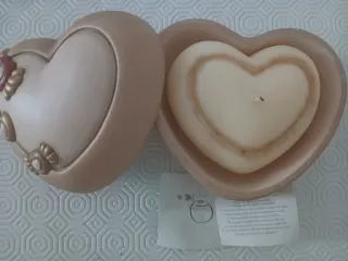 Bellissimo scrigno a forma di cuore in ceramica originale Thun, ideale per un regalo speciale o per decorare la tua casa. Il cuore è composto da 2 parti separate (cuore superiore decorato e cuore inferiore). Al suo interno è presente una candela con stoppino a forma di cuore. Materiale: Ceramica originale Thun color crema e beige con cuori in rilievo (come da marchio Thun sotto il cuore inferiore) All'interno, una candela beige a forma di cuore con stoppino. Dimensioni: 12x13 cm circa e altezza 7cm circa. Nuova mai usata ma SENZA scatola originale