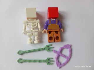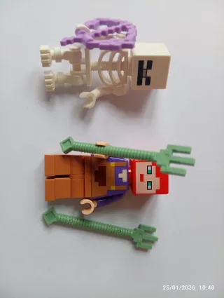 Set di mini figure LEGO Minecraft. - Mini figure Scheletro con catena viola. - Mini figure personaggio con tridente verde.