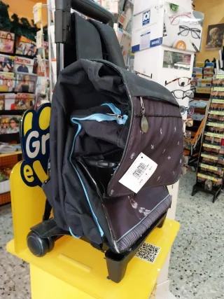 Zaino scolastico nero, pratico e resistente, con ruote per un facile trasporto. - Tessuto resistente. - Dettagli azzurri. - Tasca frontale con zip.