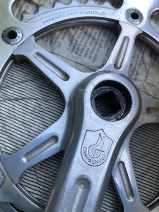 Guarnitura Campagnolo Nuovo Record vintage - Logo Campagnolo inciso. - Dettaglio PATENT CAMPAGNOLO inciso. - Corona da 52/42 denti.