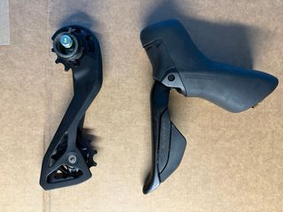 Comando cambio sram rival axs 12v disc smontato dopo caduta per parti di ricambio, la leva ha dei segni e c’è la vernice nera. Pinza con pasticche