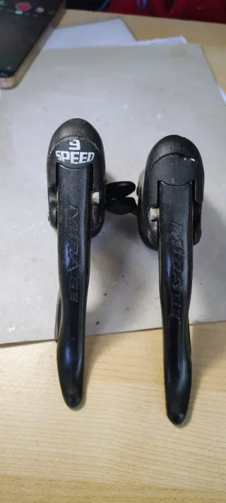 Coppia di leve/comandi Campagnolo Mirage 2/3v + 9v (DX + SX). Funzionano perfettamente, scatti precisi. Coprileva originali usurati con piccoli tagli (vedi foto). Normali segni d’uso. Ideali come ricambio o per restauri bici corsa. Guardate il mio account, ci sono selle e altri oggetti compatibili! Se volete più di un articolo scrivetemi che ci mettiamo d'accordo!