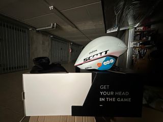 Casco Scott Cadence Plus MIPS, taglia S, utilizzato per la Vuelta DSM. Design aerodinamico e protezione MIPS. - Colore bianco con dettagli rossi e neri. - Logo SCOTT ben visibile. - Patch postnl e SENA presenti.