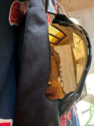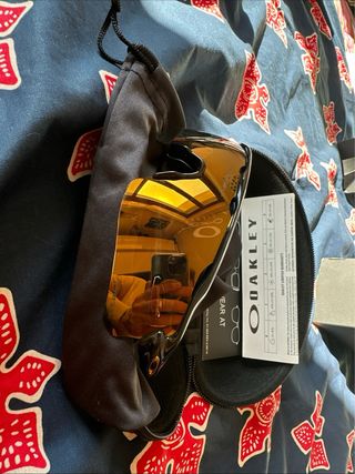 Occhiali da sole Oakley Radar EV Path con lenti a specchio. - Montatura nera lucida. - Lenti color oro. - Custodia protettiva inclusa. - Panno per la pulizia.